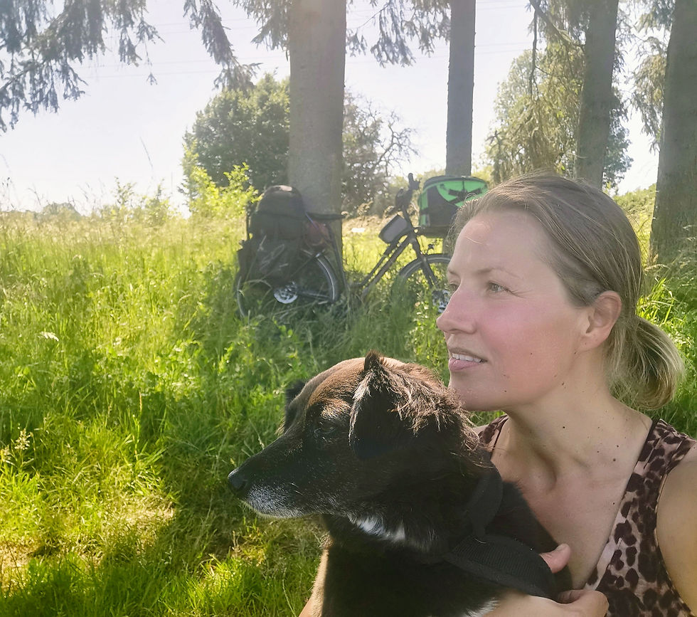 Al viel dat reuze tegen. Die bereikbaarheid van die zwarte puntjes op de kaart van Frankrijk; met z'n heuvels, een bepakte fiets, een hondje voorop en een hittegolf. Mijn theorie van zo'n 70km - 100km per dag fietsen werd snel bijgeschaaft naar maximaal 70km! En dat bleek al een hele uitputtingsslag.