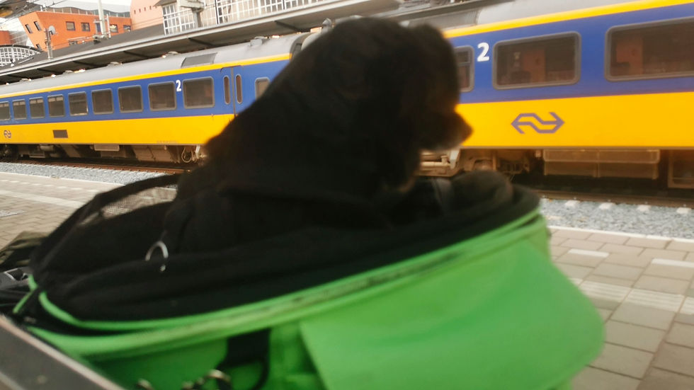 We vertrokken op een dag dat het KNMI weer eens code geel/oranje/rood had afgegeven wegens harde windstoten en regen etc. Ervaring leert dat ik het KNMI en haar codes niet meer zo serieus neem maar hoe dichter ik bij Amersfoort kwam (met een zwaar bepakte fiets, tegenwind en een steeds donker wordende lucht), hoe meer ik ging denken dat het misschien toch iets te ambitieus was om mijn tocht per fiets voort te zetten. Vanuit Amersfoort vertrekt een rechtstreekse trein naar Den Haag dus net voor de hoosbui die we zojuist tegemoet hadden gefietst, bereikten we het overdekte perron waar de intercity naar Den Haag centraal zou verschijnen. Noël wist niet hoe snel ze de trein in moest klimmen (en plofte opgelucht naast haar knapzak in een vierzitje).