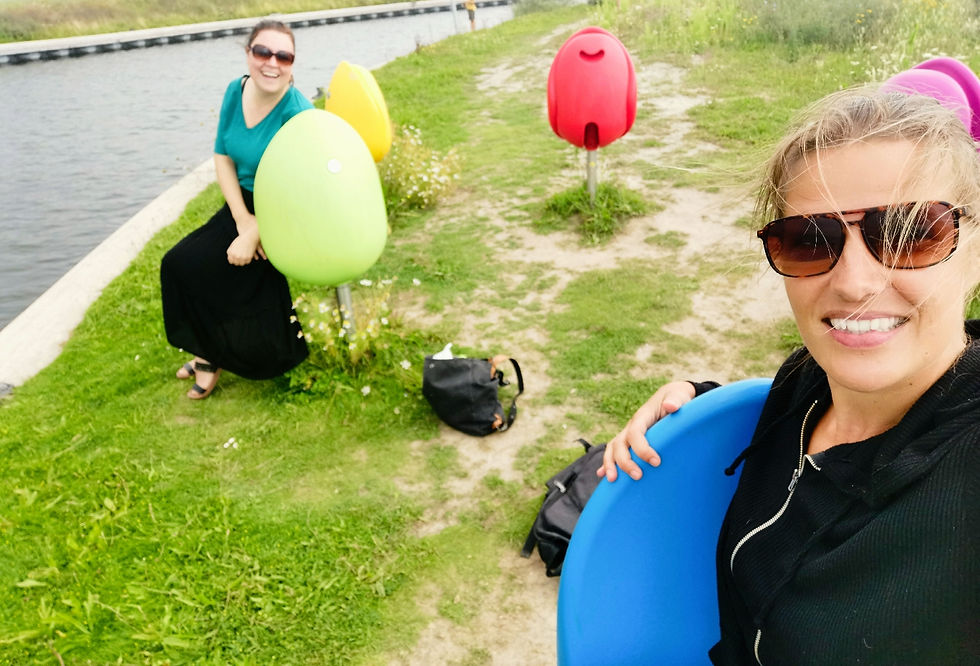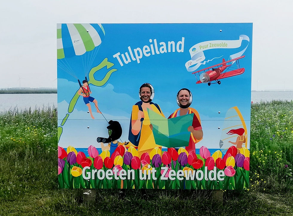Begin van de avond kwamen we aan bij zuslief in Ermelo waar we twee nachtjes mochten logeren. Aangezien zij ook vrij was konden we de volgende dag een dagje toerist in eigen streek uithangen. Zo gingen we met onze fietsen naar strand Horst om daar met het fietspontje naar Zeewolde te gaan. Als toeristische attractie hadden we het Tulpeiland uitgekozen voor een bezoekje. Met een klein strandje en een aangelegd eilandje in de vorm van een tulp (waarop allerlei mooie bloemen bloeiden) maakten we een wandeling en verorberden we onze zelf meegenomen lunch op de bijpassende tulpenstoeltjes. Na het bezoekje aan tulpeiland zetten we onze koers voort richting Harderwijk waar we bij onze tante op de thee mochten komen (die samen met haar partner onlangs een chaletje in de buurt heeft).
