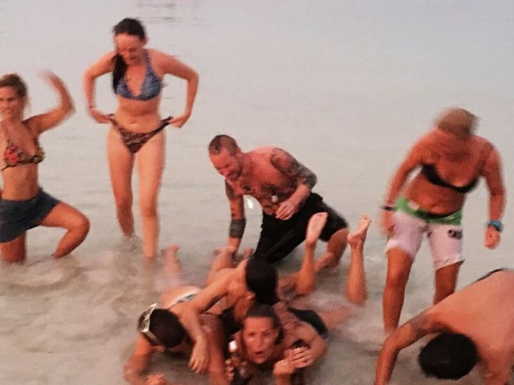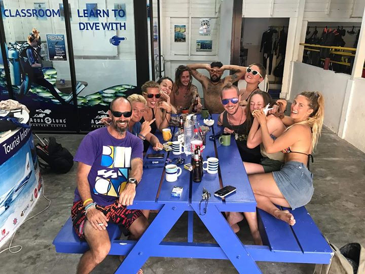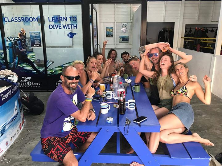 Na een aantal drankjes, dansjes, eten en giant strides vanaf het bovendek, vertrok de boot naar de volgende bestemming. Aangezien wij onze scooters en al onze bezittingen nog bij het strand hadden achtergelaten, verlieten wij glamerous de boot middels de glijbaan en zwommen terug naar de kust. We reden door naar de duikshop waar we een ander deel van de ons-kent-ons mensen aantroffen. Het scheen tevens de verjaardag te zijn van een van hen dus we besloten het feest voort te zetten op het strand aldaar. Weer een paar uur later besloten we, afgepeigerd en voldaan, terug naar het resort te gaan, waar iedereen instortte en in bed dook. Misschien niet de meest productieve dag maar wat een gezelligheid!