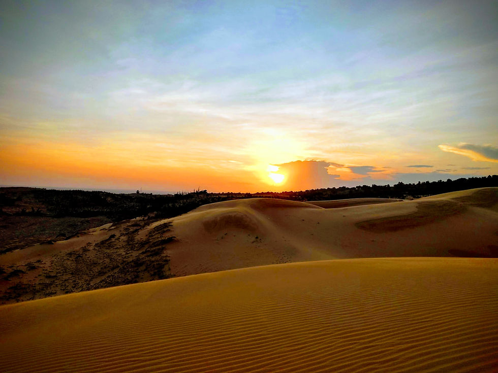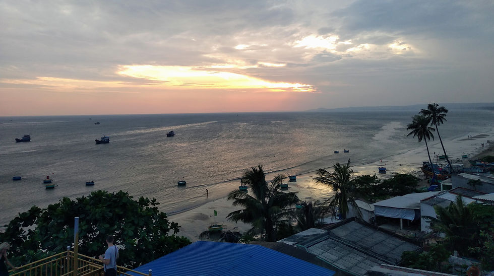 Mui Ne is het tegenovergestelde van Saigon. Van origine is het een klein vissersdorp. Aangezien het de laatste jaren steeds populairder is geworden onder toeristen (met name door het goede surfklimaat), rijzen ook hier de hotels als paddenstoelen uit de grond. Op dit moment zitten we op de overgang van laag- naar hoogseizoen dus het is nu nog erg rustig. In het laagseizoen komen met name toeristen uit Azië naar Mui Ne, die deze plaats gebruiken als tussenstop (vaak voor 1 nacht) alvorens hun volgende bestemming te bezoeken. In het hoogseizoen (november tot maart) schijnen er meer Westerse toeristen te komen voor een langer verblijf voor het surfen. Ik werk in de Lodge van de surfschool (ze hebben 8 kamers en een restaurant op een dakterras met een fabuleus uitzicht). Het 'werk' is dus vrij eenvoudig. In de vrije uurtjes ben ik veelal op het strand te vinden al stoeiend met mijn surfplank in de golven (gisteren (na 4 dagen oefenen) voor het eerst gelukt om een paar seconden te blijven staan alvorens gracieus weer ten val te komen whoopwhoop).