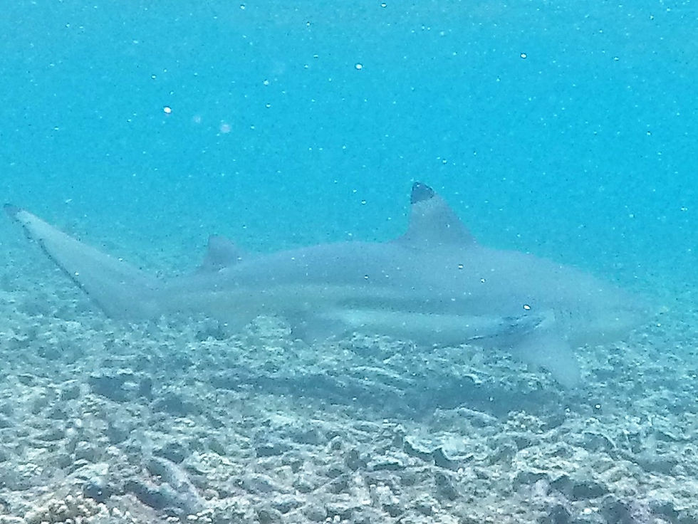 Na de 'werkzaamheden' van dag 3 besloot ik om aan het einde van de dag te gaan snorkelen in shark bay. Er was mij verteld dat de grootste kans om haaien te zien tijdens zonsopkomst of -ondergang was. Om het water te bereiken dien je eerst over een aantal rotsen te klimmen waarna je bij een trapje komt die je veilig het water in leidt. Op het moment dat ik het trapje bereikte, kwam er net een groep uit het water. Ongeduldig als ik was om het water in te gaan, besloot ik via de rotsen te gaan. Al snel bleek dat een verkeerde keuze. De rotsen waren spekglad en voor ik het wist ging ik onderuit en gleed ik de zee in. Helaas had ik mijn voeten en hand open gehaald tijdens de val waardoor het water om mij heen rood kleurde. Elk nadeel kent zijn voordeel: de kans om een haai te zien groeide gestaag.